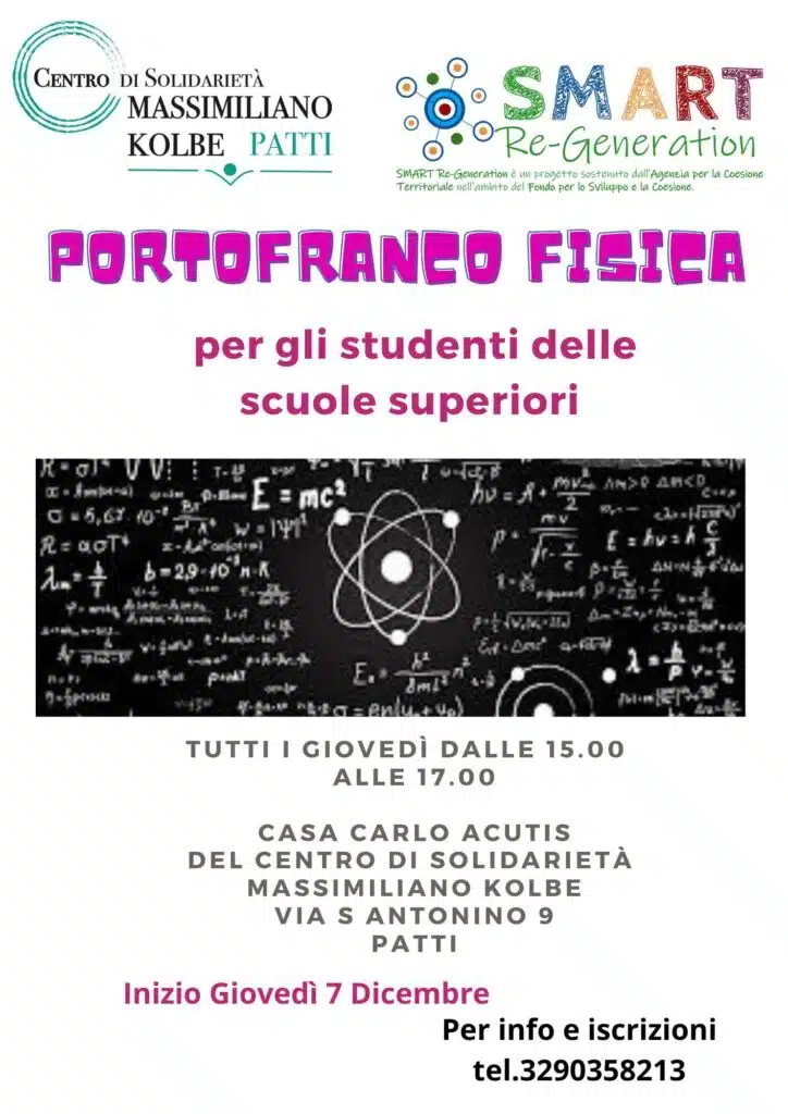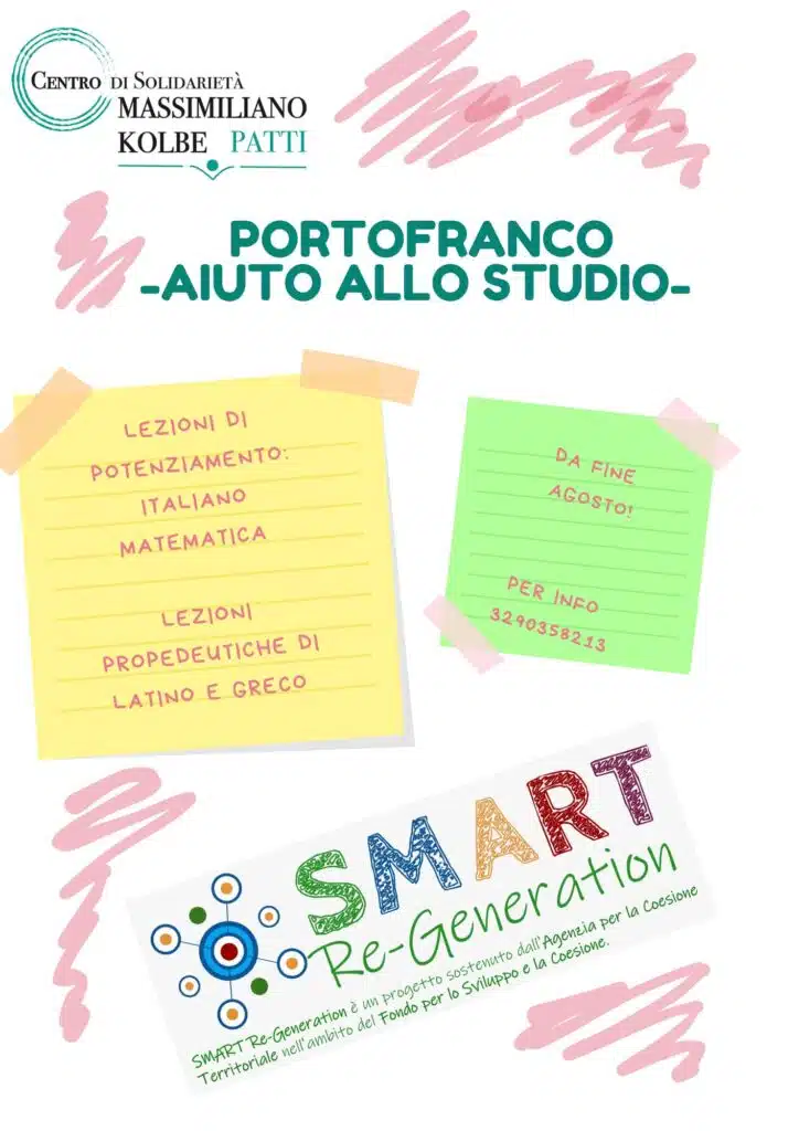 Portofranco è un servizio di aiuto allo studio destinato ai ragazzi delle scuole medie secondarie. Allo stato attuale siamo attivi sulle seguenti discipline: Matematica (tutti i Giovedì dalle 15:00 alle 17:00), Inglese (tutti i Mercoledì dalle 15:00 alle 17:00), Italiano (tutti i Giovedì dalle 15:00 alle 17:00), Fisica (tutti i Martedì dalle 15:00 alle 17:00). Il servizio è gratuito e le iscrizioni possono essere effettuate dal Lunedì al Venerdì dalle 9:00 alle 12:00